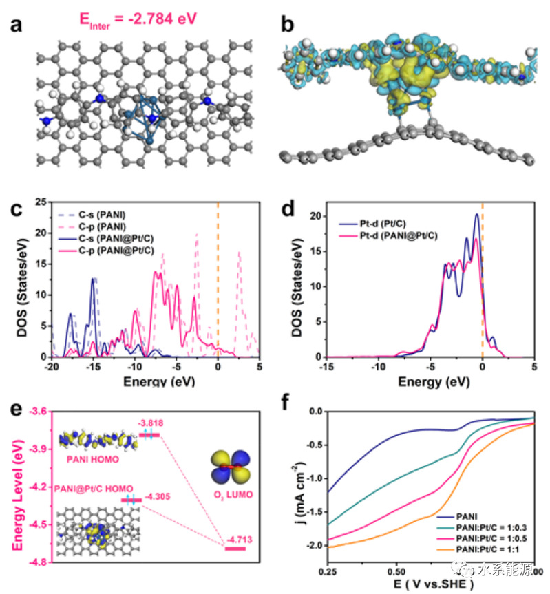 a)优化PANI@Pt/C结构,计算PANI与Pt/C的相互作用能。b)PANI@Pt/C的变形电荷密度。c)C和d)Pt在PANI中的态偏密度。e)优化结构并计算出PANI、PANI@Pt/C和O2的前沿分子轨道能。f)聚苯胺和PANI@Pt/C复合材料的ORR极化曲线。