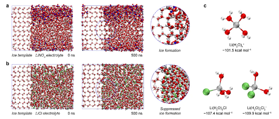 图 3.(a) LiNO3 和 (b) LiCl 电解质中的冻结过程。左侧为冰模板。红色、白色、银色、蓝色和绿色球分别代表 O、H、Li、N 和 Cl 原子。(c) LiCl 电解质中的低能 Li+ 溶剂化结构。