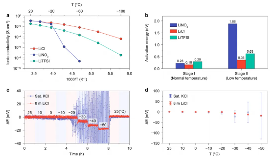 图 4. (a) 20 至 -100 ℃ 温度范围内电解质的离子导电率。(b) 离子传导的活化能。(c) Ag/AgCl 参比电极与饱和 KCl 和 8 mL LiCl 电解质在不同温度下的电位曲线。(d) Ag/AgCl 参比电极的电位变化。