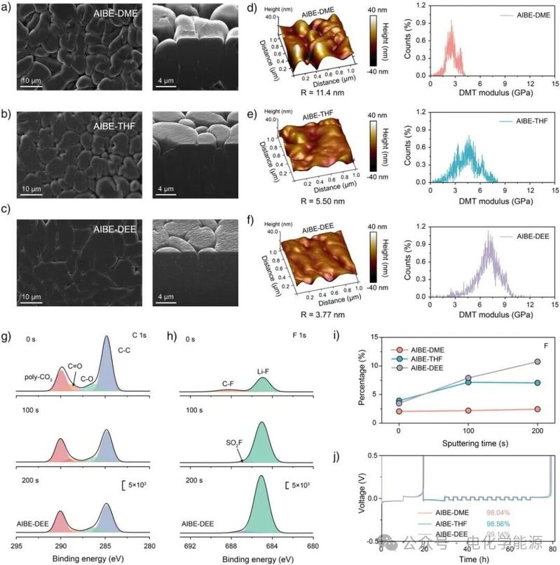 从形貌、界面与电化学性能角度分析 AIBE 对锂金属的保护作用。(a)-(c) 聚焦离子束扫描电子显微镜(FIB-SEM)图像,显示 AIBE-DEE 中锂沉积层更致密平整、晶粒更大,而 AIBE-DME 中存在大量空隙;(d)-(f) 原子力显微镜(AFM)表征表明,AIBE-DEE 形成的 SEI 粗糙度最低(3.77 nm),且德贾金 - 穆勒 - 托罗波夫(DMT)模量最高(6.9 GPa),界面均匀性与机械稳定性更优;(g)-(h) X 射线光电子能谱(XPS)深度剖析显示,AIBE-DEE 衍生的 SEI 中 Li-F 信号随溅射时间保持显著,证明其富无机内层结构;(i) F 元素原子百分比数据进一步验证 SEI 的无机成分富集;(j) 库伦效率曲线显示 AIBE-DEE 的 Li||Cu 半电池 CE 达 99.14%,电化学可逆性最佳。