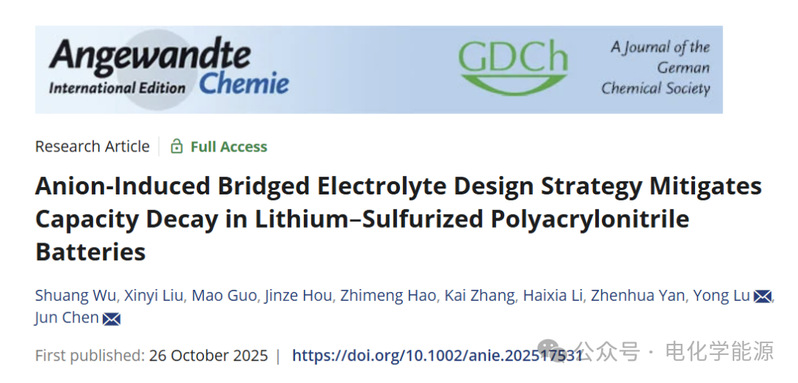 Wu, S., Liu, X., Guo, M., Hou, J., Hao, Z., Zhang, K., Li, H., Yan, Z., Lu, Y., & Chen, J. (2025). Anion-induced bridged electrolyte design strategy mitigates capacity decay in lithium–sulfurized polyacrylonitrile batteries. Angewandte Chemie International Edition, e202517531.