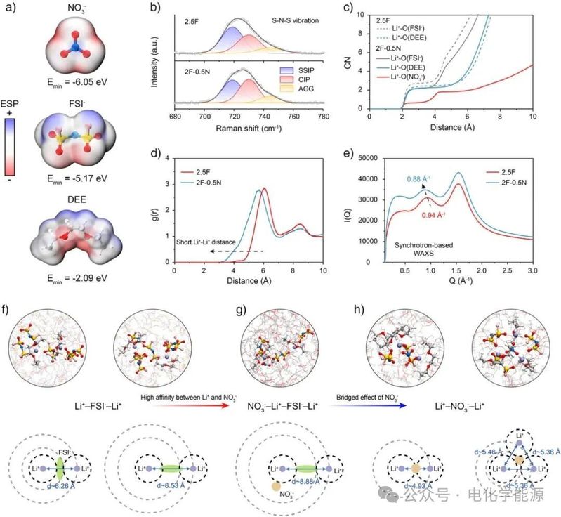 从理论与实验层面验证 NO₃⁻的桥联机制。(a) 通过静电势(ESP)分析,显示 NO₃⁻具有最负的 ESPₘᵢₙ(-6.05 eV),更易与 Li⁺结合;(b) 拉曼光谱(S-N-S 振动峰)表明引入 NO₃⁻后,溶剂分离离子对(SSIP)占比降低,接触离子对(CIP)与聚集体(AGG)占比增加;(c) 配位数(CN)数据显示,NO₃⁻会竞争 Li⁺配位,降低 Li⁺与 FSI⁻、DEE 的配位数;(d) Li⁺-Li⁺径向分布函数(RDF)证明 AIBE 中短距离 Li⁺-Li⁺(3-5 Å)相互作用增强;(e) 同步辐射广角 X 射线散射(WAXS)显示 AIBE 的溶剂化簇尺寸更大(Q=0.88 Å⁻¹,r=0.71 nm);(f)-(h) 通过分子结构示意图对比 [Li⁺-FSI⁻-Li⁺]、[NO₃⁻-Li⁺-FSI⁻-Li⁺] 与 [Li⁺-NO₃⁻-Li⁺],直观呈现 NO₃⁻的桥联效应缩短 Li⁺间距。