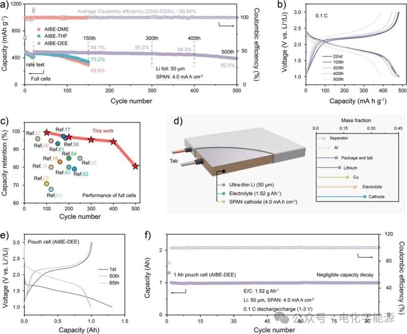 AIBE 在实际电池体系中的性能表现。(a) 全电池循环曲线显示,AIBE-DEE 组装的 Li||SPAN 全电池(50 μm 锂箔、4.0 mAh cm⁻² SPAN)在 500 次循环后容量保持率达 80.5%,远高于 AIBE-DME(150 次循环保持 63.9%)与 AIBE-THF(150 次循环保持 73.2%),且平均 CE 接近 99.94%;(b) 电压曲线显示 AIBE-DEE 的充放电平台极化小;(c) 性能对比图表明该工作的全电池循环寿命与容量保持率优于已报道的先进电解质体系;(d) 软包电池结构示意图标注其关键参数(贫电解质 1.52 g Ah⁻¹、高负载正极);(e)-(f) 软包电池性能曲线显示,1 Ah 级软包电池在 95 次循环后容量衰减可忽略,平均 CE 达 99.95%,验证 AIBE 的实际应用潜力。