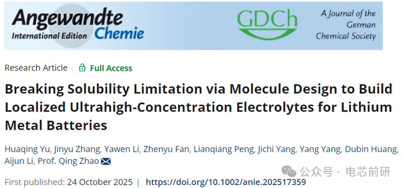 该成果以“Breaking Solubility Limitation via Molecule Design to Build Localized Ultrahigh-Concentration Electrolytes for Lithium Metal Batteries”为题发表在Angew. Chem. Int. Ed.上。