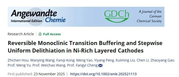2025年11月23日,南开大学程方益(国家杰青)团队在Angewandte Chemie International Edition期刊发表题为“Reversible Monoclinic Transition Buffering and Stepwise Uniform Delithiation in Ni‐Rich Layered Cathodes”的研究论文,南开大学Hou Zhichen、Wang Wanying为论文共同第一作者,程方益为论文通讯作者。