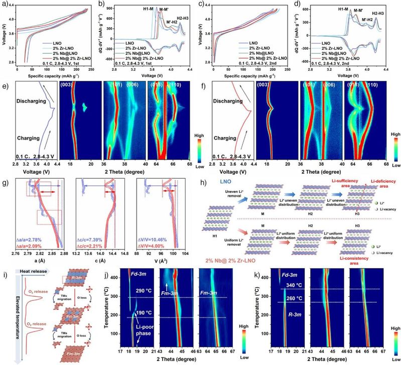 图2. 结构演变。a), b) 首圈和c), d) 第二圈的充放电曲线及相应的dQ dV⁻¹曲线。e) LNO和f) 2% Nb@ 2% Zr-LNO的电压曲线及原位XRD图谱等高线图。g) LNO(蓝色)和2% Nb@ 2% Zr-LNO(红色)在充电过程中晶格参数的变化。h) LNO在充电过程中的相分离演化机制,以及2% Nb@ 2% Zr-LNO的固溶体相演化机制。i) 富镍正极材料在加热过程中结构降解示意图。j) LNO和k) 2% Nb@ 2% Zr-LNO在4.3 V充电状态下,从25°C加热至450°C过程中的原位高温XRD二维等高线图。