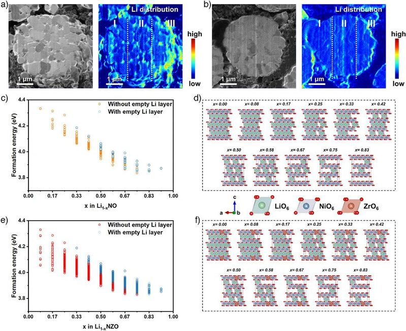 图3. Li分布。4.3 V充电状态下a) LNO和b) 2% Nb@ 2% Zr-LNO颗粒横截面Li分布的TOF-SIMS分析。c), d) LNO和e), f) Zr-LNO在不同脱锂状态下的形成能及对应的最低形成能结构。