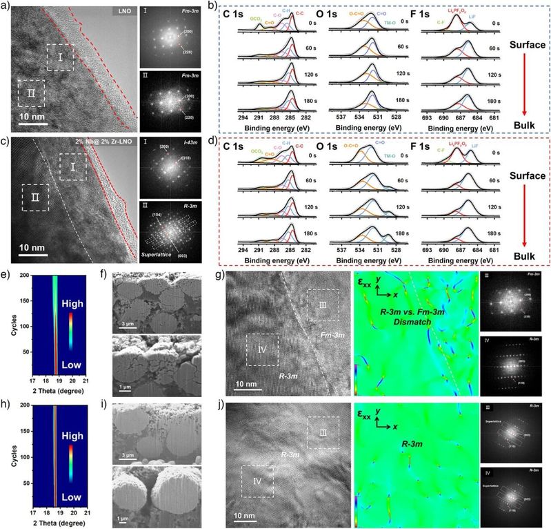 图6. 循环后结构演变。a) 第100次循环后LNO和c) 2% Nb@ 2% Zr-LNO近表面区域的HRTEM图像及相应的FFT图样。b) LNO和d) 2% Nb@ 2% Zr-LNO的C 1s、O 1s和F 1s XPS深度剖析谱图。e) LNO和h) 2% Nb@ 2% Zr-LNO在循环过程中的原位XRD分析。f) LNO和i) 2% Nb@ 2% Zr-LNO第100次循环后的横截面SEM图像。g) LNO和j) 2% Nb@ 2% Zr-LNO第100次循环后体相区域的HRTEM图像及相应的GPA和FFT图样。
