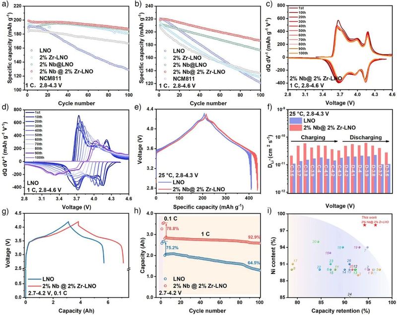 图5. 循环稳定性。a) 2.8–4.3 V和b) 2.8–4.6 V电压范围内,1 C倍率下2% Nb@ 2% Zr-LNO及对比样品的循环性能。c) 2% Nb@ 2% Zr-LNO和d) LNO在2.8–4.6 V电压范围内循环期间相应的dQ dV⁻¹分析。e) GITT曲线和f) 2% Nb@ 2% Zr-LNO与LNO中计算得到的Li⁺扩散系数。g) 2% Nb@ 2% Zr-LNO||石墨和LNO||石墨软包电池的充放电容量曲线及h) 相应的循环性能。i) 已报道富镍层状氧化物正极的Ni含量与容量保持率对比图。