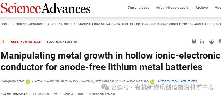 Manipulating metal growth in hollow ionic-electronic conductor for anode-free lithium metal batteries. Peng et al., Sci. Adv. 12, eadt2630 (2026) DOI: 10.1126/sciadv.adt2630