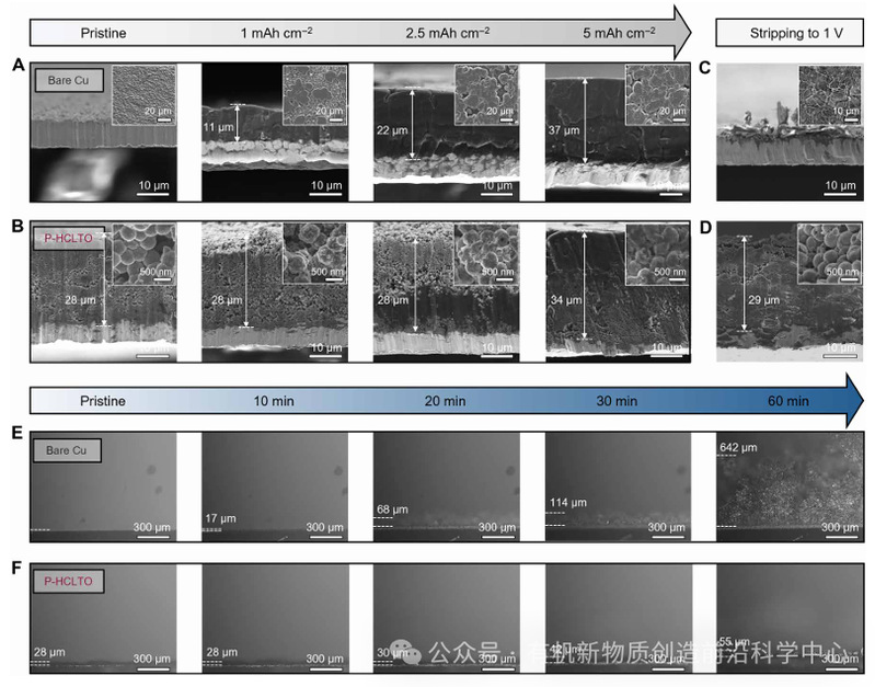 解析:此图直观对比了“沉积行为有何不同”。在裸铜上,锂沉积杂乱、多孔、体积膨胀巨大,剥离后留下大量“死锂”。而在P-HCLTO上,锂被限制在夹层内部沉积,厚度几乎不变,剥离后夹层恢复原状。原位OM动态展示了HIEC对枝晶生长的有效抑制。