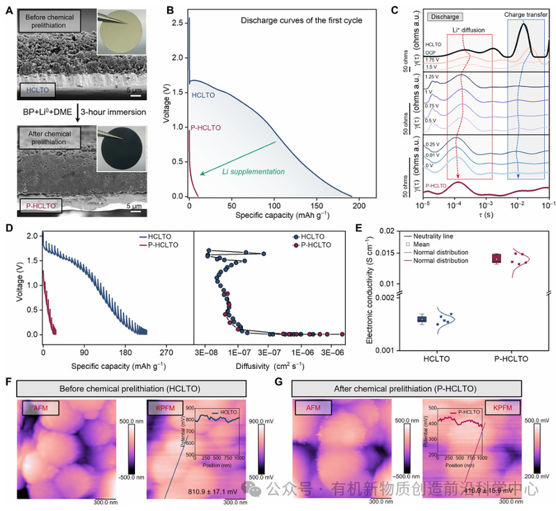 解析:此图展示了“材料如何优化”。化学预锂化使材料变黑(A),补偿了首次锂损耗(B),显著提升了离子扩散能力和电子电导率(D, E),并创造了均匀且更优的锂离子迁移表面环境(F, G)。预锂化是激活HIEC优异性能的关键步骤。