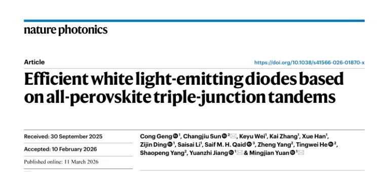 该研究题为“Efficient white light-emitting diodes based on all-perovskite triple-junction tandems”,围绕多结钙钛矿发光器件的集成难题,提出了一种无损转移印刷制备新策略,成功实现了高效率、超宽色域的红/绿/蓝三结白光钙钛矿发光二极管(LED),为推动钙钛矿发光技术在高色域背光源和超高清显示应用方向上的发展提供了重要技术支撑。